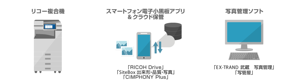 リコーの「工事写真撮影・管理パック」なら、工事写真に関する一連の業務を、効率化できます。まずはスマートフォンのアプリから工事情報を入力し、そのまま現場を撮影。小黒板は使わないため、それを持つ人手も要らず、一人で撮影が可能です。撮った写真データはすぐさまクラウドに保存されるので、あとから画像を取り込む手間もありません。そして、入力しておいた工事情報に基づき、自動で仕分けまでしてくれます。現場や事務所での作業時間を大幅に圧縮しながら、データへのアクセス性も向上。国が推進する新技術(NETIS)も活用できるため、対象案件の入札時には工事評点もアップします。