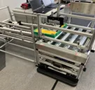 入荷配膳工程より運搬されてきた部材を、ロック治具を活用し組立開始。指示書通りに組立作業を完了させることで治具のロックが外れ、組立品の取り出しが可能となるため組み立てミスの防止が図れます。