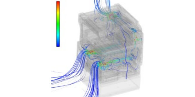 複合機は、安定した画質で印刷するために、機内温度を一定以下に保つ必要があります。しかし、機内には熱源を含み部品が数千点あり、形状も入り組んでいて気流は複雑になります。以前は、設計が決まった後の実機での実験により評価をしており、熱による部品の変形や、故障などの問題が発生していました。