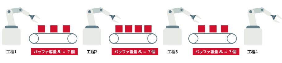 製造現場での生産効率に影響する設計項目のひとつに、生産ラインの「バッファ容量の配分」があります。バッファとは、ロボットや作業者がスムーズに工程を進めるための、工程間の仕掛り品置き場です。バッファを設置することで生産効率が上がりますが、容量を増やしすぎると設置スペースが過大となり、リードタイムも長引いてしまいます。ラインの性能を左右するため、重要な設計項目です。
