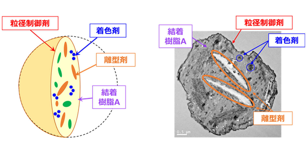 粒径制御剤や着色剤、離型剤、結着樹脂などさまざまな材料が含まれる