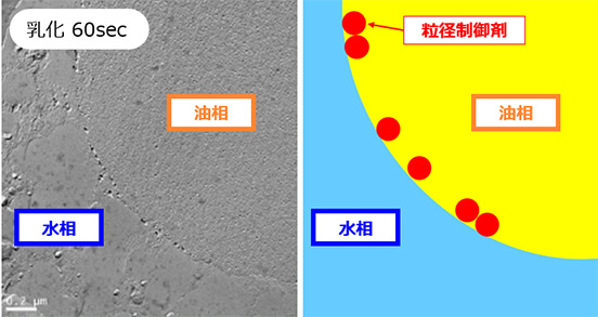 重合トナーは、水相(水+粒径制御材)と油相(溶剤+樹脂をベースにさまざまな材料を配合)を混ぜ合わせた後、様々な造粒プロセスを加えて粒子をつくります。トナーとしての性能は内部の材料の粒径や配置によって決まりますが、各プロセスにおける材料の動きが分からない(ブラックボックスである)ため、狙い通りのトナー品質にするためには試作を繰り返す必要がありました。