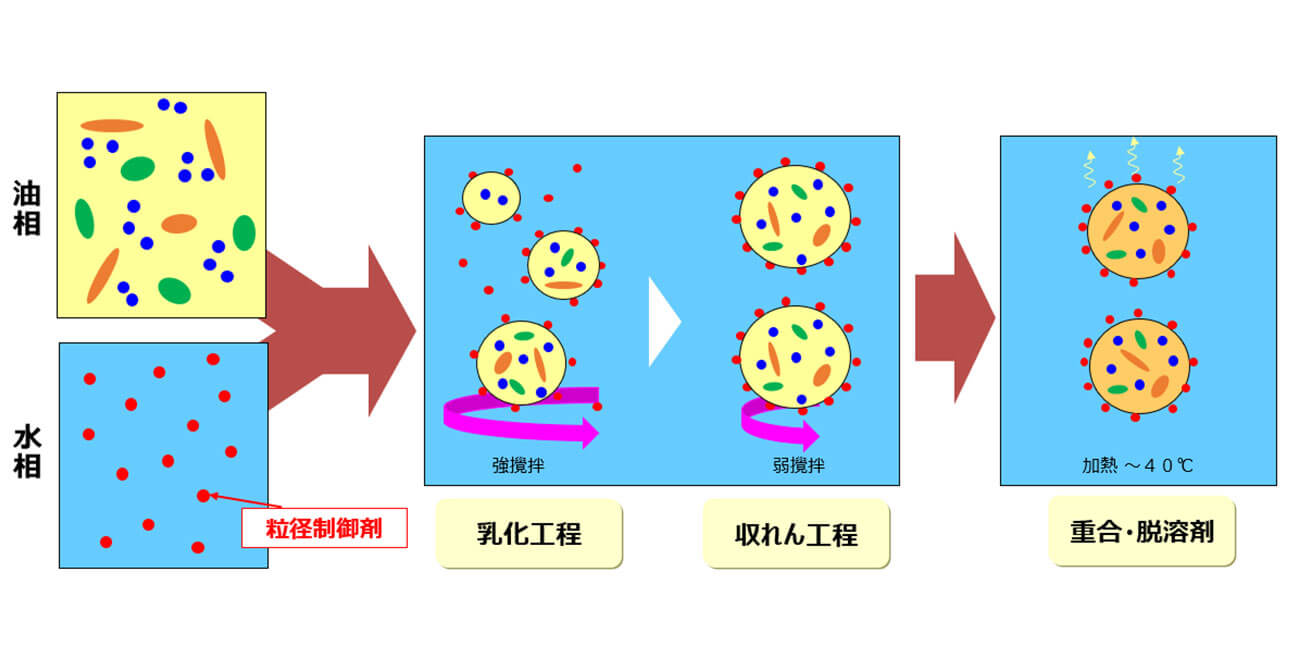 乳化工程:トナー母材の油相と水相を混合・撹拌(かくはん)し、より均一な大きさのトナー粒子を作り出す工程。材料の経時変化が発生する。