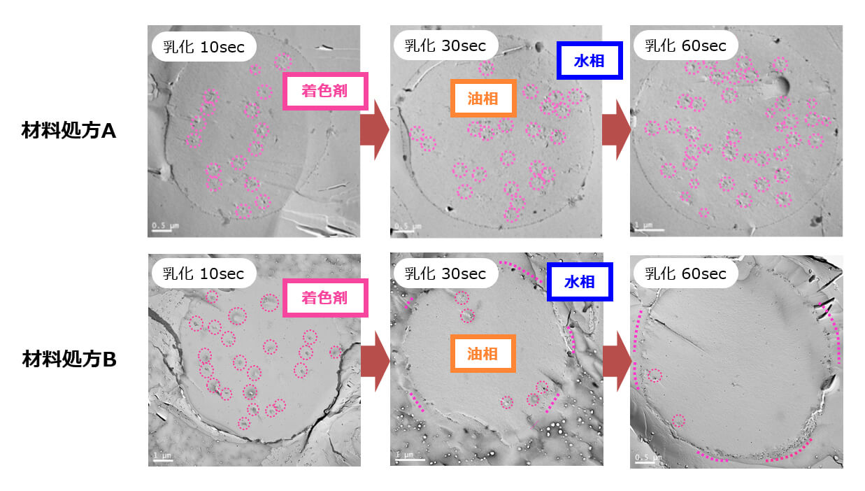 液中のnm~μmサイズの材料の状態を観察するには、材料を瞬間的に凍結して観察する技術(凍結技法)があり、主に食品や化粧品の材料分析に適用されています。これまでは、マヨネーズ・生クリームなどの食品や化粧品などのように経時変化しないものに適用していましたが、リコーは独自のノウハウで、短い時間で変化する材料の状態も観察できるようにしました。これを重合トナーの乳化工程※に適用し、液中の材料分布の可視化を実現しました。