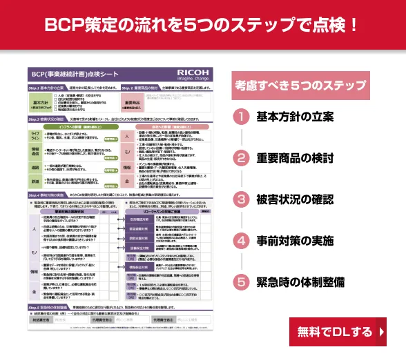 中小企業庁発行のBCP策定運用指針に基づいて、BCP策定の流れを5つのステップで整理したシートをご用意しました。ぜひ、ダウンロードしてご活用ください。