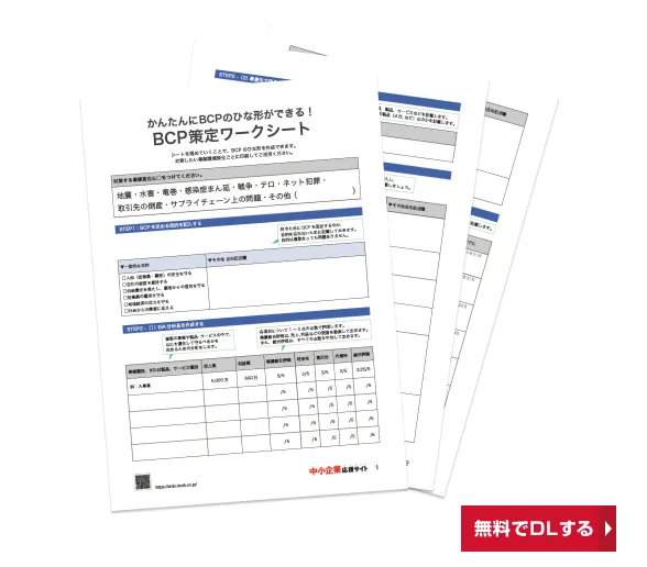 シートをうめていくことで、簡単にBCPの雛形が作衛できます。経営者が自分だけで策定できる、もっとも手軽なBCPとして、ぜひダウンロードして、活用ください。