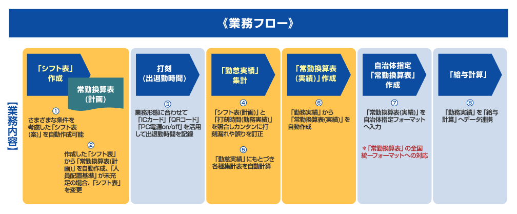 また、職員の「勤怠実績」の実績集計、「常勤換算表」の作成も担当者にとって負担の一因です。 このような定型的な業務は、ICT化することにより効率化が図れ、時間短縮することが可能です。