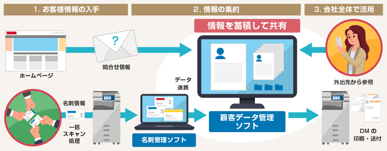 リコージャパンの「顧客データ収集活用パック」は、お客様や取引先の情報を効率よくデータ化し、一元管理・活用を可能にします。