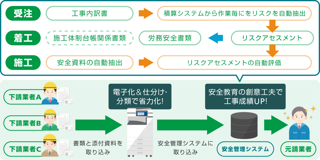 まずは受注した工事の情報からリスクを洗い出し、リスクの低減を検討します。さらに日々の安全管理業務で発生する文書を工事情報と一元管理することで、現場代理人の負荷を軽減します。