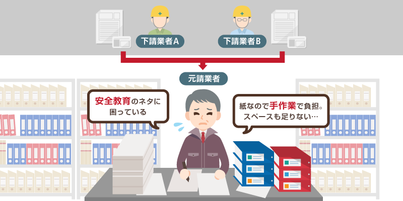 協力会社を含め人や企業、重機などの情報管理や危険予知活動などの日々の安全管理に関連する書類の作成や管理に時間がかかりすぎる