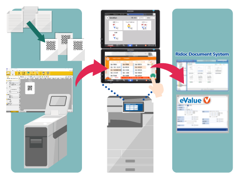 QRコードにファイル名を登録またはマーカーペンでファイル名にしたい箇所を指定して複合機で取り込むことで、ファイル名が自動的に変更されクラウド上に保管されます