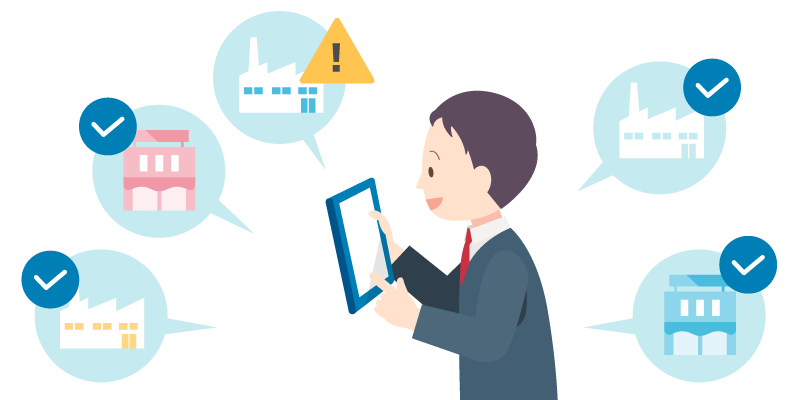 複数ある出先の入力状況も専用システムで閲覧可能。特に温度データは定期的にデータを自動取得しているので異常時に即応でき食料品の品質を維持し無駄にしません。