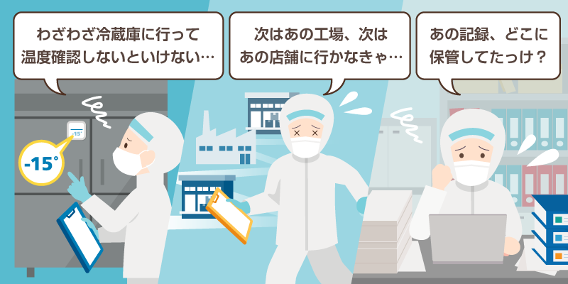 複数ある工場や店舗ごとに個別に衛生管理しており、温湿度の異常が発生しても出勤しないと分からず食品の廃棄となるケースも・・・。