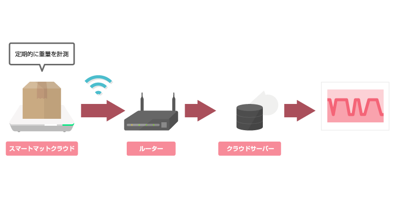 在庫管理対象の重量を定期的に自動計測、クラウド上にデータを蓄積し、在庫数や消費量を可視化します。重量で計測するので、目視確認がしづらい部品や、液体などの原材料も残量把握もしやすくなります。また、無線機能を搭載しているため、離れた場所でも自動でデータを送信、遠隔管理ができます。