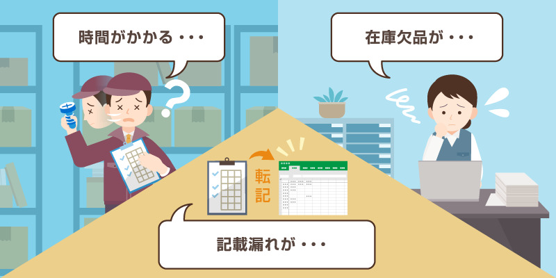 入出庫の記録は紙に記載しているが、記載漏れや誤りで帳簿と数があわないことがよくある。その結果、余分に在庫を仕入れてしまい、過剰在庫が発生してしまう。