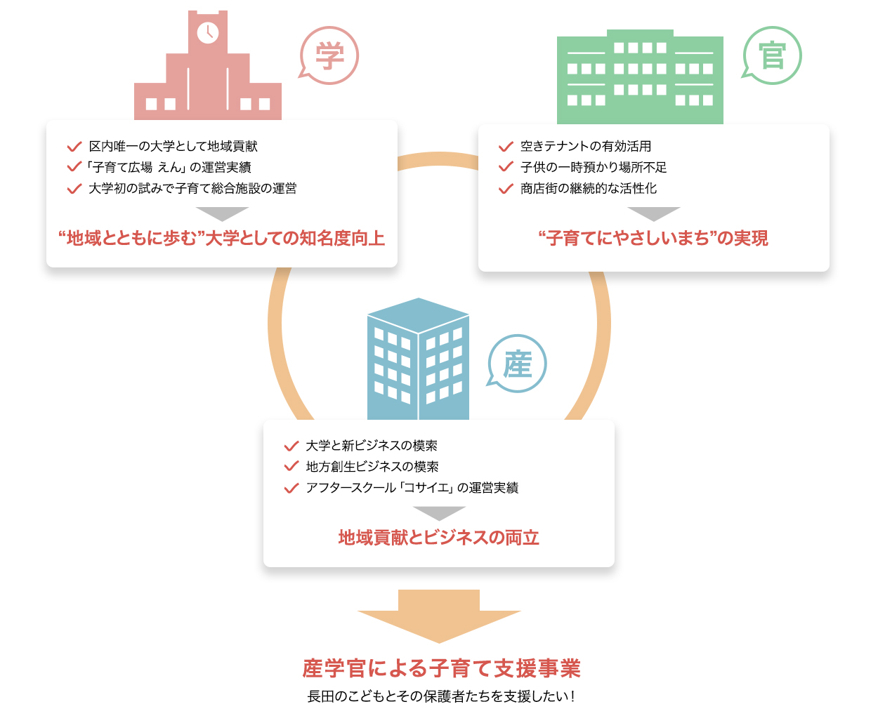 この利活用に関して、リコージャパン、神戸常盤大学、大正筋商店街のそれぞれの思惑が一致し、産学官連携によるユニークな子育て支援施設の設立に向かいました。