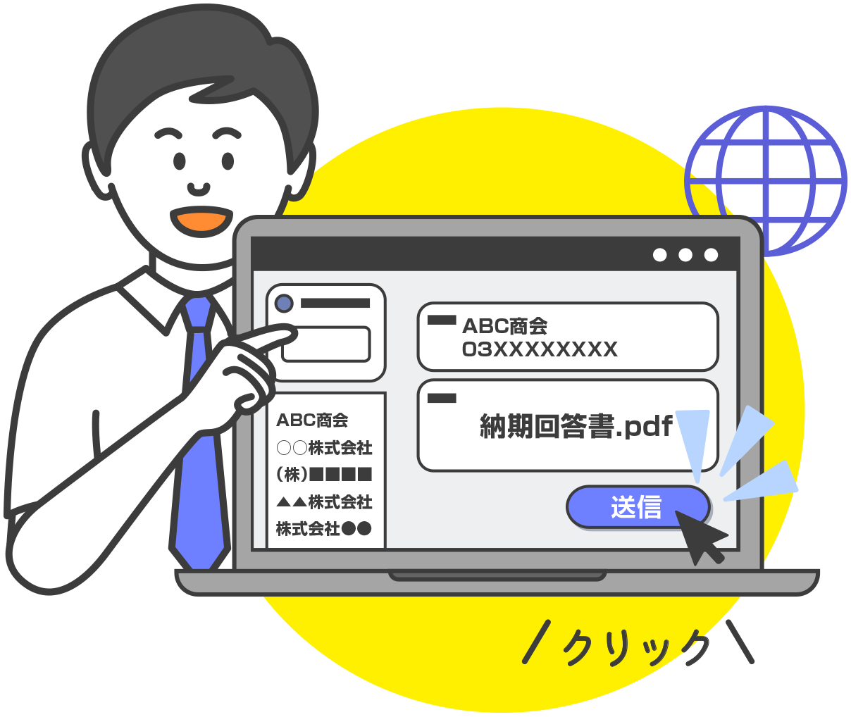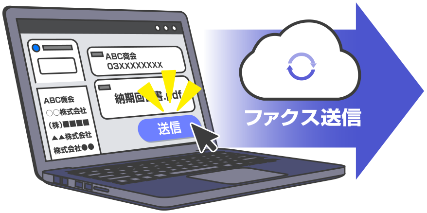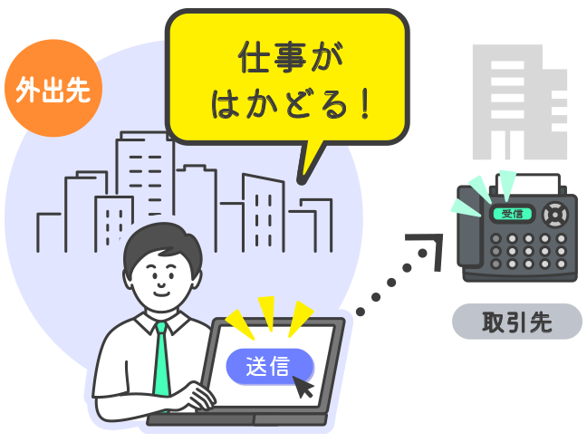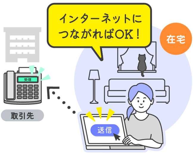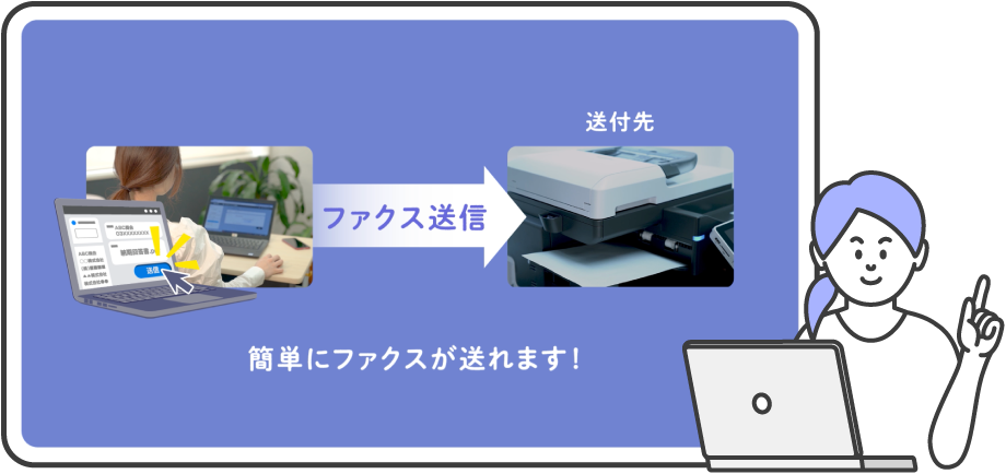 パソコンをインターネットに接続すれば、ブラウザー内の簡単操作で、いつでもどこでもファクス送信できます。