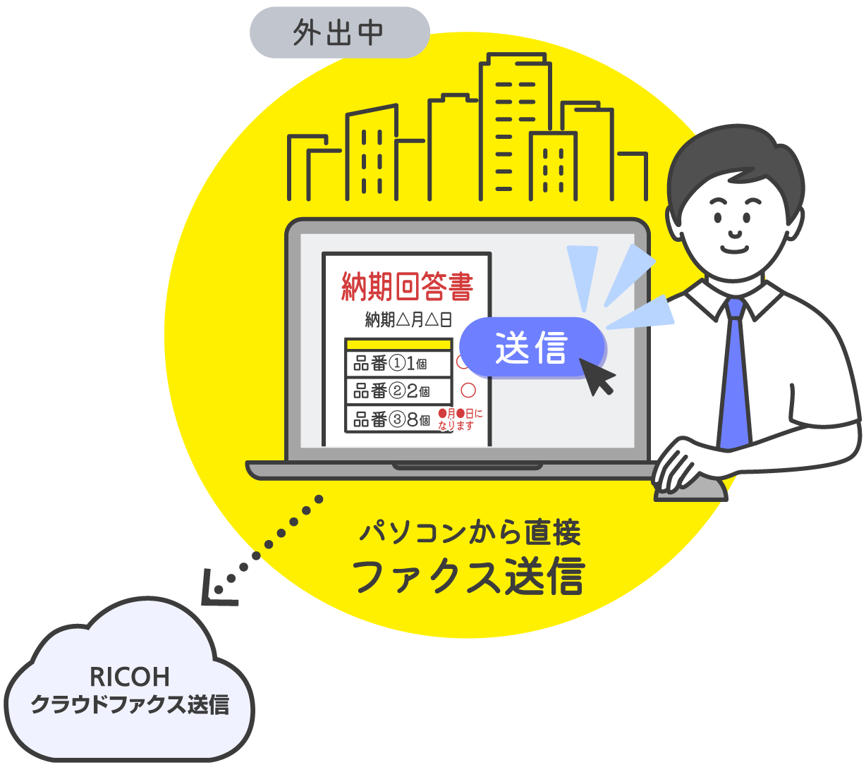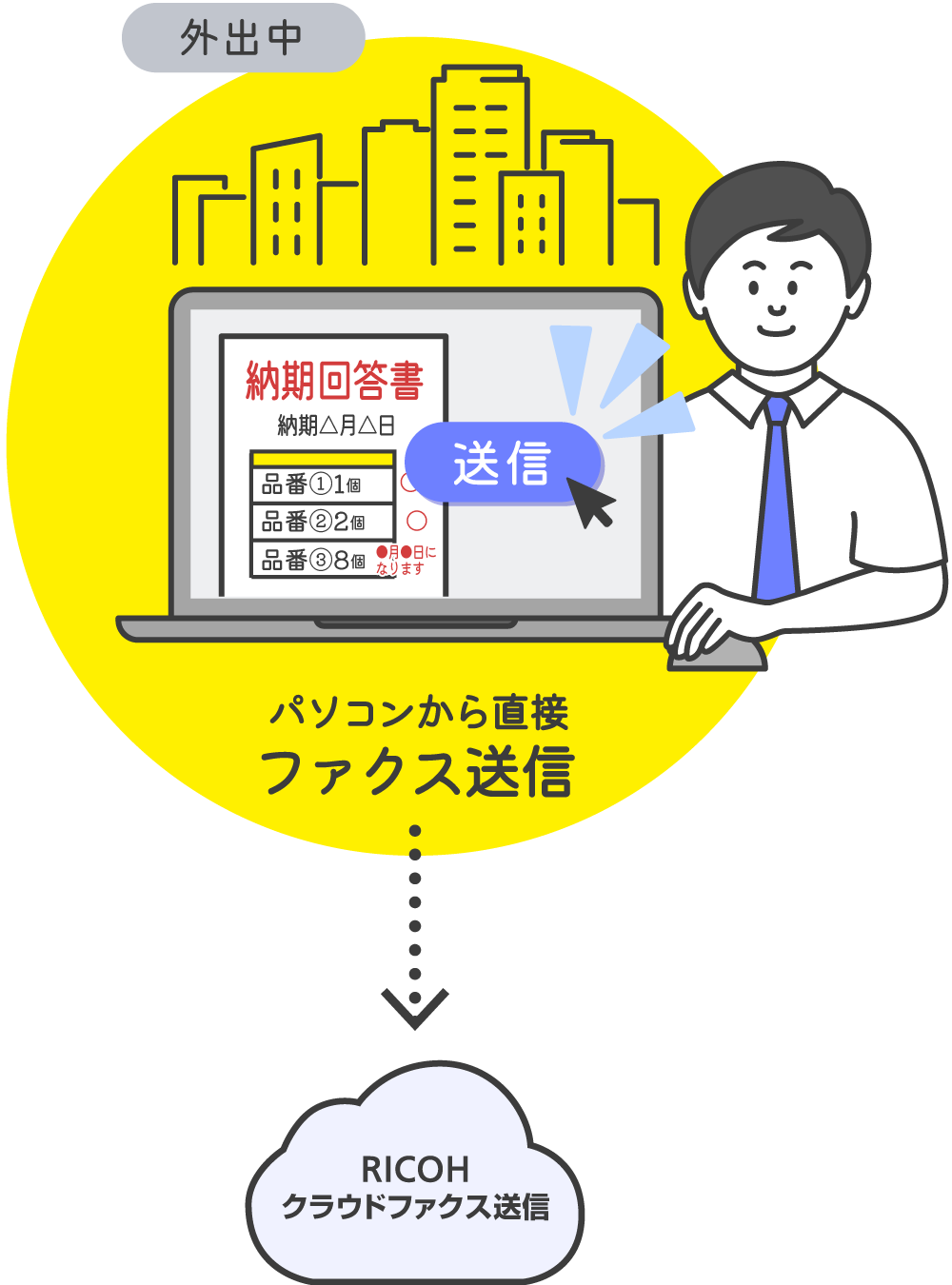 さらに「RICOH クラウドファクス送信」で回答書などをファクス送信することで、 ファクスによるやりとりが欠かせないビジネスに柔軟・自在に対応できます。