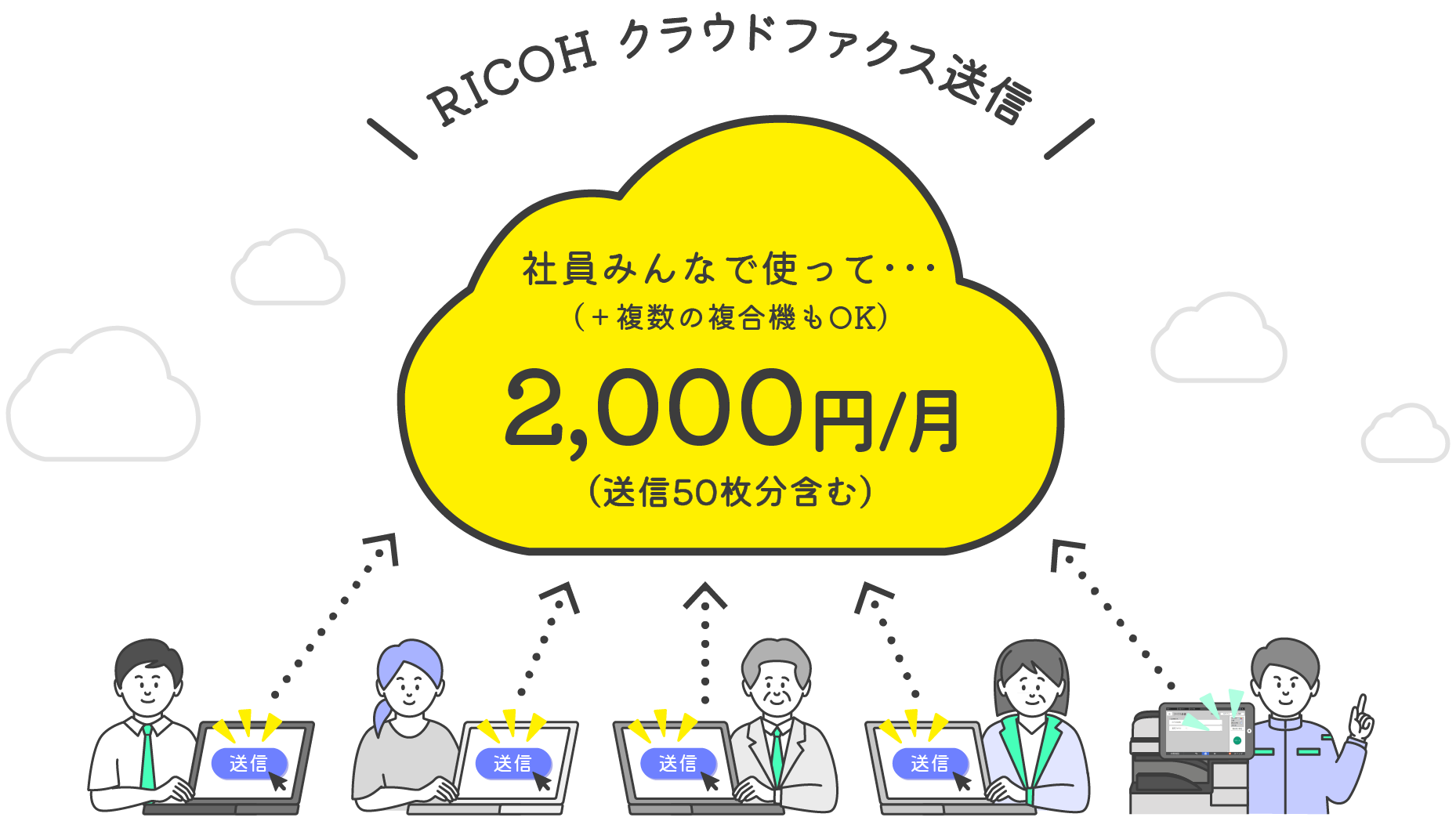 *送信50枚分を含みます。51枚目/月からは14円/枚(消費税別)が加算されます。別途、導入時に「RICOH クラウドアプリケーション スタートパック」5,000円(消費税別)/1契約 のご購入が必要です。