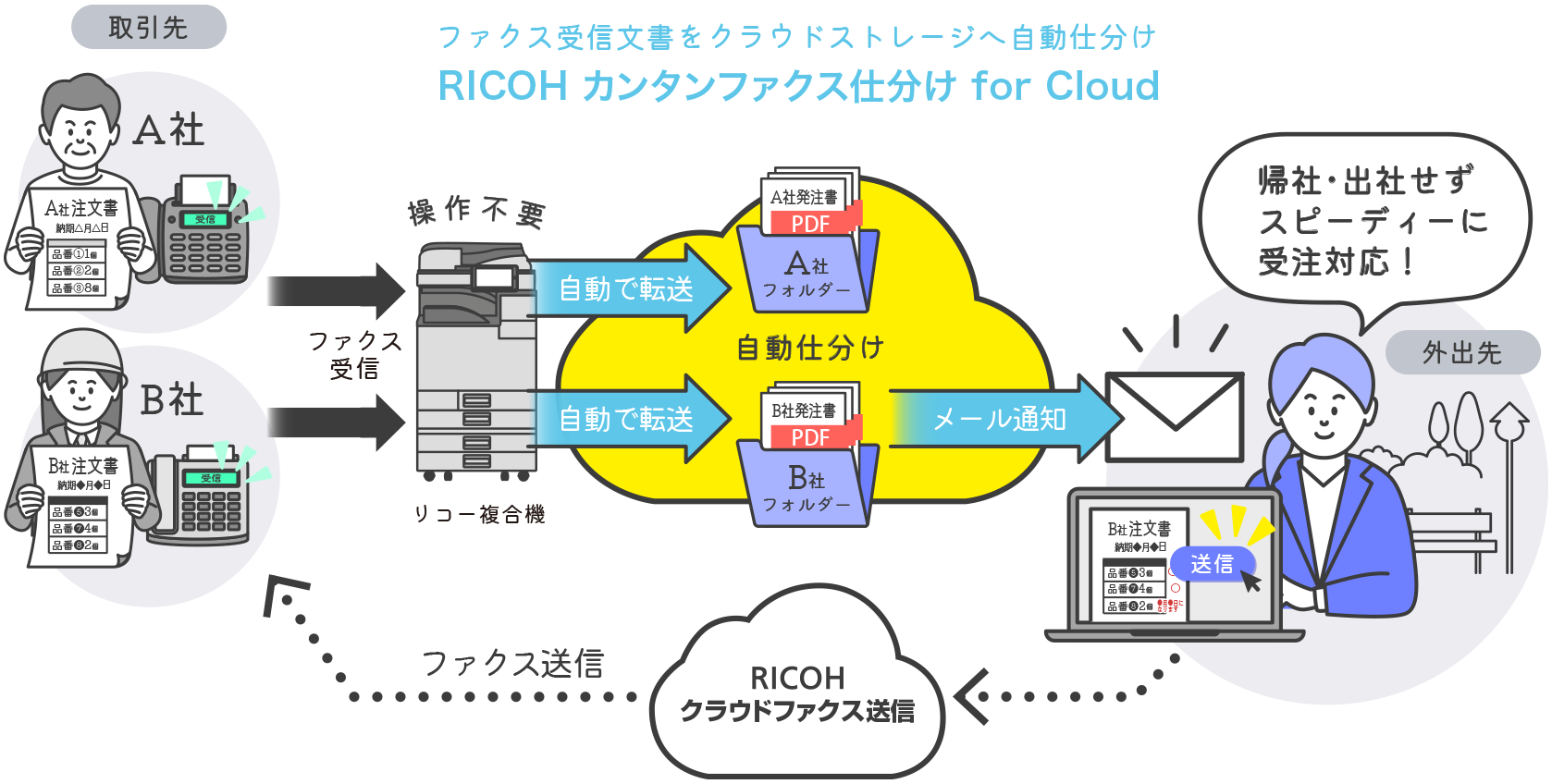 リコー複合機のファクス受信文書を、「RICOH カンタンファクス仕分け for Cloud」により クラウドストレージに自動転送。送信元の会社名などで仕分けして保管し、スピーディーに確認できます。