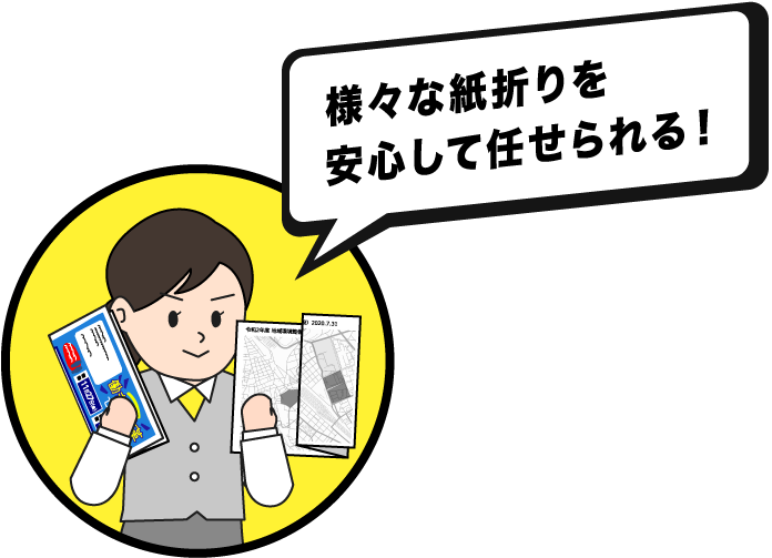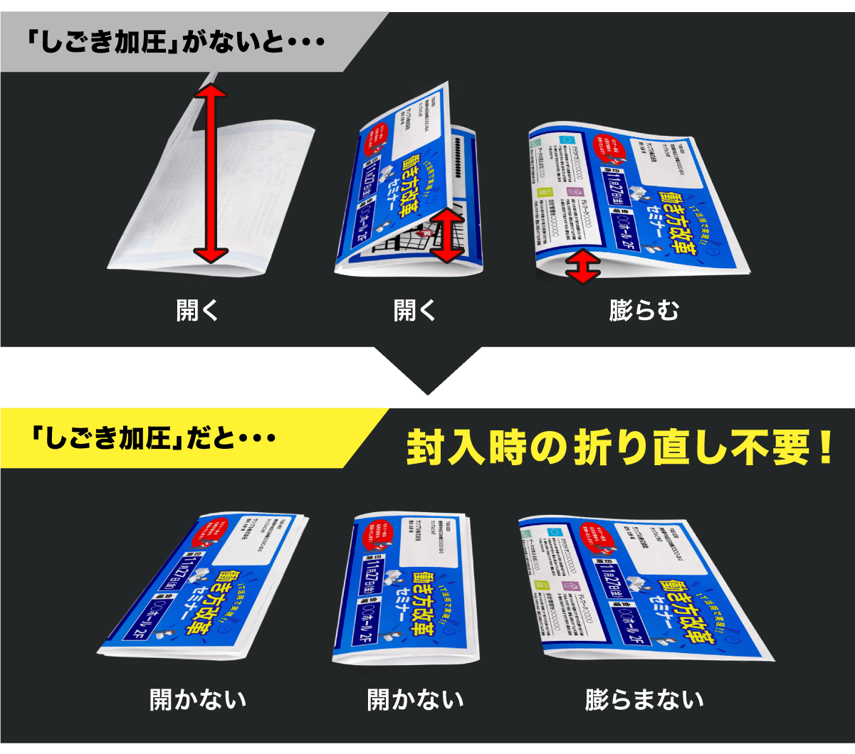 しごき加圧の技術で「開く」「膨らむ」を防ぎ、丁寧な紙折り