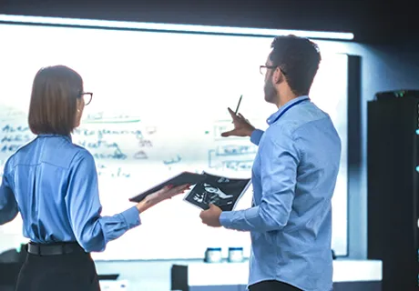 RICOH Collaboration Board Cloud*を使い、自社内だけではなくお客様や取引先など、離れた拠点間でもリアルタイムに板書の共有が可能。