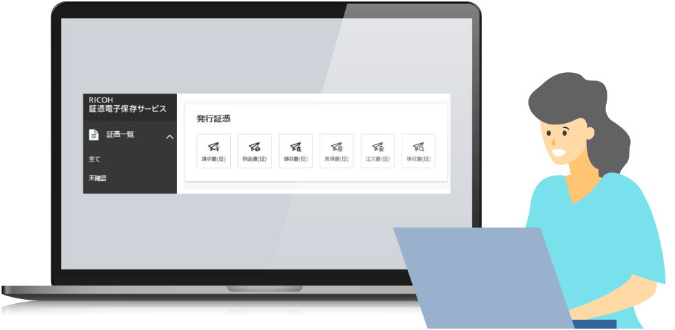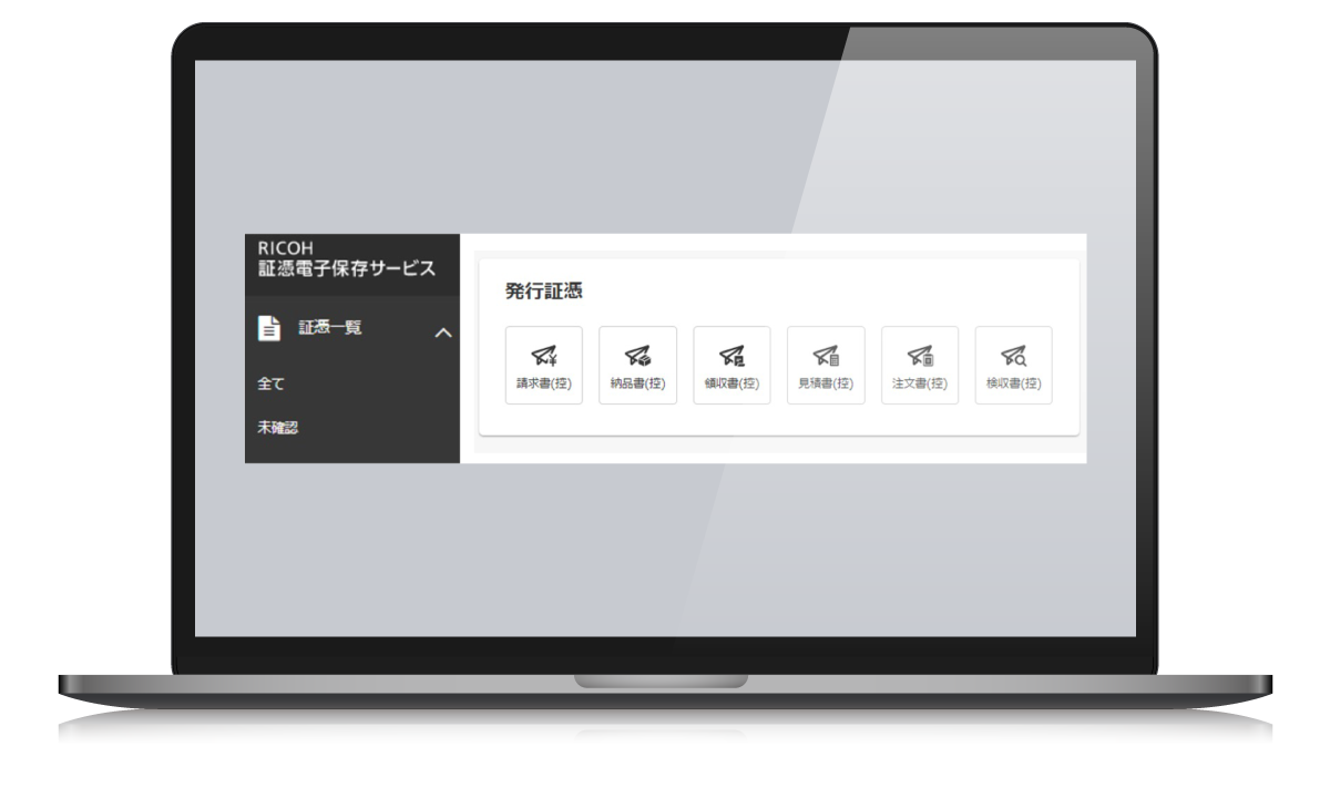 「RICOH 証憑電子保存サービス」は、請求書、納品書、領収書、見積書、検収書、注文書など複数証憑の保存に対応!様々な証憑をクラウド上で一元管理することができ、過去の証憑の閲覧・検索も簡単です。