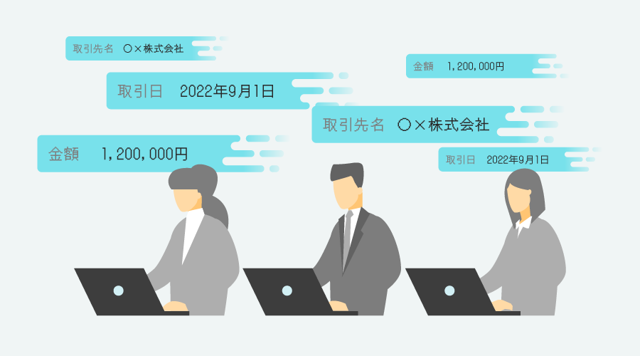 電子帳簿保存法に対応した電子保存をする際は、「取引先名」「取引金額」「取引日」の3つの項目の入力が必要です。「RICOH 証憑電子保存サービス」は、検索項目の入力代行サービス*をご用意しています。