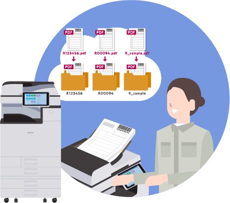その情報でスキャンデータを、クラウドストレージサービスへのファイル名付与保管やフォルダー振り分けができます。