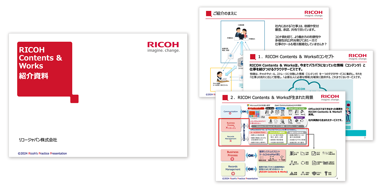 そして「RICOH Contents & Works」を、整理された業務の流れを踏まえ導入します。業務の性質に合わせて、意思決定に必要な情報に瞬時にアクセスできるシステムが構築できるため、経営判断の高速化が実現できます。