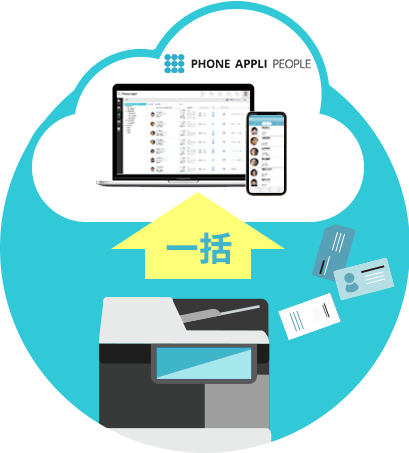 複合機に名刺を置いてスキャンすれば、一括でPHONE APPLI PEOPLEに登録できます。