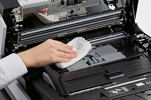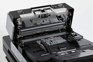 A 自動原稿送り装置(ADF)の読み取りユニットを大きく開口できるので、ガラス面やローラーの清掃がしやすく、万が一紙詰まりが発生した際の除去も簡単です。