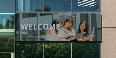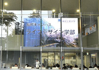 ガラス張りのキャンパス壁面に、太陽光に負けない明るさをもつ約160インチの大型LEDビジョンを設置。周囲の景観と調和した外観の印象、自然光の差し込む内観の解放感はそのままに、ダイナミックな情報発信を実現されています。