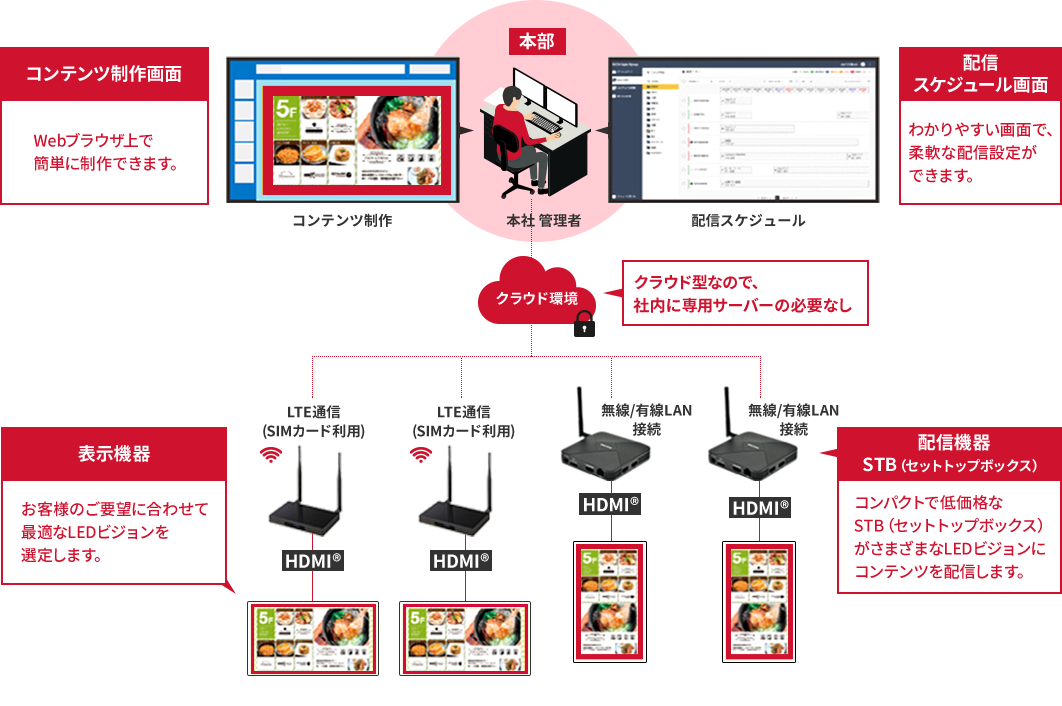 LEDビジョンに加え、リコーデジタルサイネージのクラウドサービス(月額/年額)と映像受信機であるSTB(セットトップボックス)をご購入いただくだけで、あとはインターネットに接続すれば簡単にデジタルサイネージを始められます!※導入前に、LEDビジョンとSTB(セットトップボックス)の接続検証をお願いします。