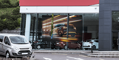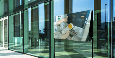 ガラス張りの壁面に設置して店内から屋外向けの大型ビジョンを作ることができます。透過型になっているため、自然光の差し込む内観の開放感はそのままとなります。