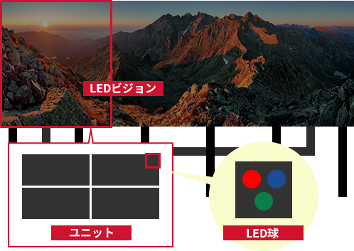 LEDビジョンはLED素子自体が発光して映像を表示します。
