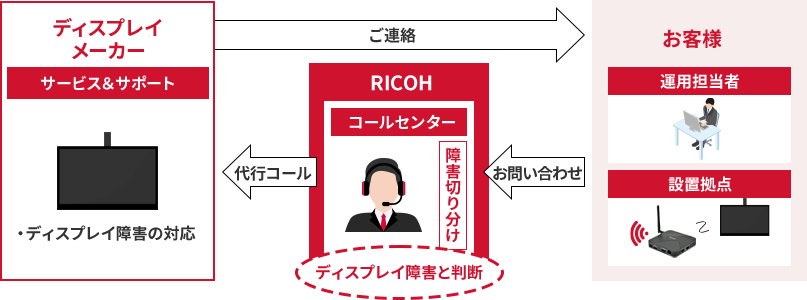 無料で承っています。リコーコールセンターの専任スタッフが障害の切り分け等を実施し、カスタマーエンジニアへ連携したり、必要があればお客様の代わりにLEDビジョンのメーカーにご連絡させていただいたりと、スムーズにサポートいたします。