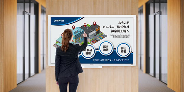 お客様向けの会社紹介から、全社への情報周知の徹底、事業所内、各部門内の情報共有と、様々な利用シーンで活用できるサイネージを販売しています。