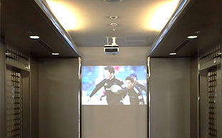 社員の視聴率が高いエレベータ前には、プロジェクターを使って簡単設置