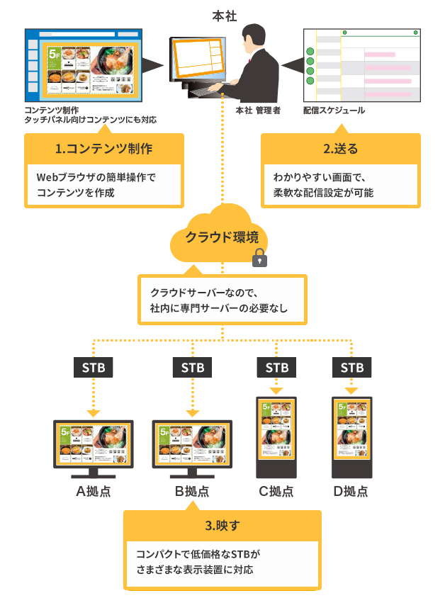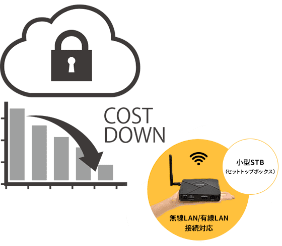 また、コンパクト&ローコストな専用STB(セットトップボックス)を使用しているため、設置も簡単。STB(セットトップボックス)をディスプレイやプロジェクターに接続し、電源投入後にネットワーク設定を行うだけで準備完了です。