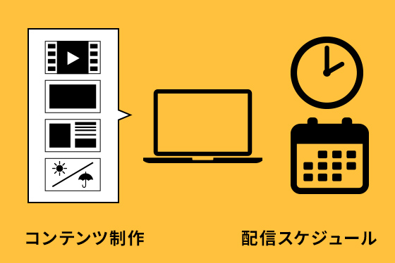 コンテンツ作成から配信設定までWebブラウザで操作可能なので、誰でも簡単にサイネージを運用できます。作成したコンテンツを複数組み合わせて番組を編成。繰り返し再生や時刻や曜日を指定しての再生など、配信のスケジュールも自在に設定可能です。また、一括配信などの柔軟な運用も可能です。