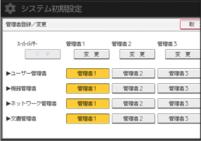 操作部から[システム初期設定]⇒[管理者用設定]⇒[管理者認証管理]⇒[管理者登録/変更]にて、設定できます。 詳しくは、製品納入時にお渡ししているセキュリティーの説明書「はじめに」「管理者認証を設定する」を参照してください。
