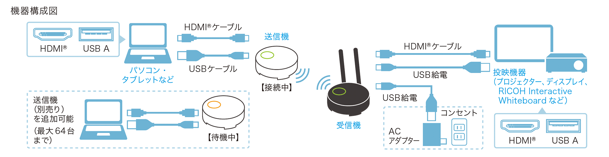 496131194371 3 | RICOH Wireless Projectionに送信機(子機×1)を追加する場合に必要です。HDMI®+micro USB接続のタイプです。 (品種コード:514300) |