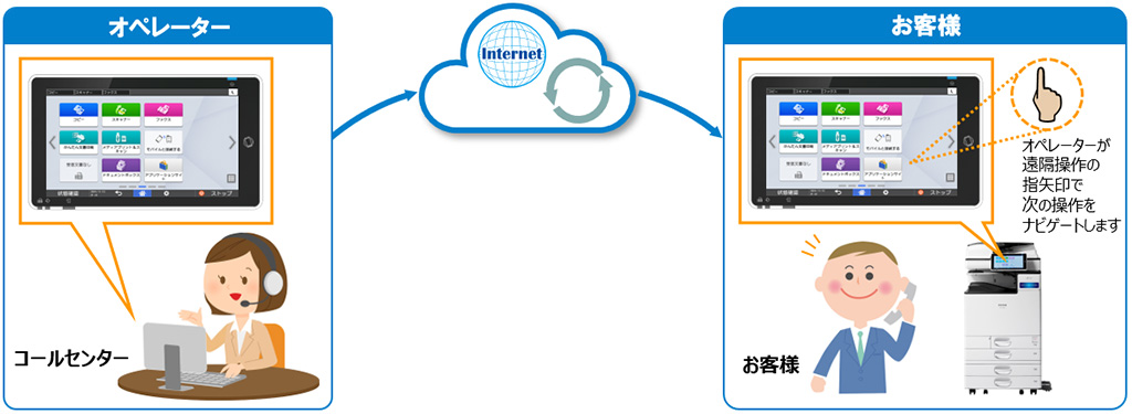 操作方法が不明な場合や各種トラブル時にお客様の複合機のパネルを遠隔で確認しながらサポートを行うサービスです。インターネット経由で、コールセンターのオペレーターが機器の画面を確認しながら操作方法の説明や障害復旧の支援を、より的確・迅速に提供いたします。