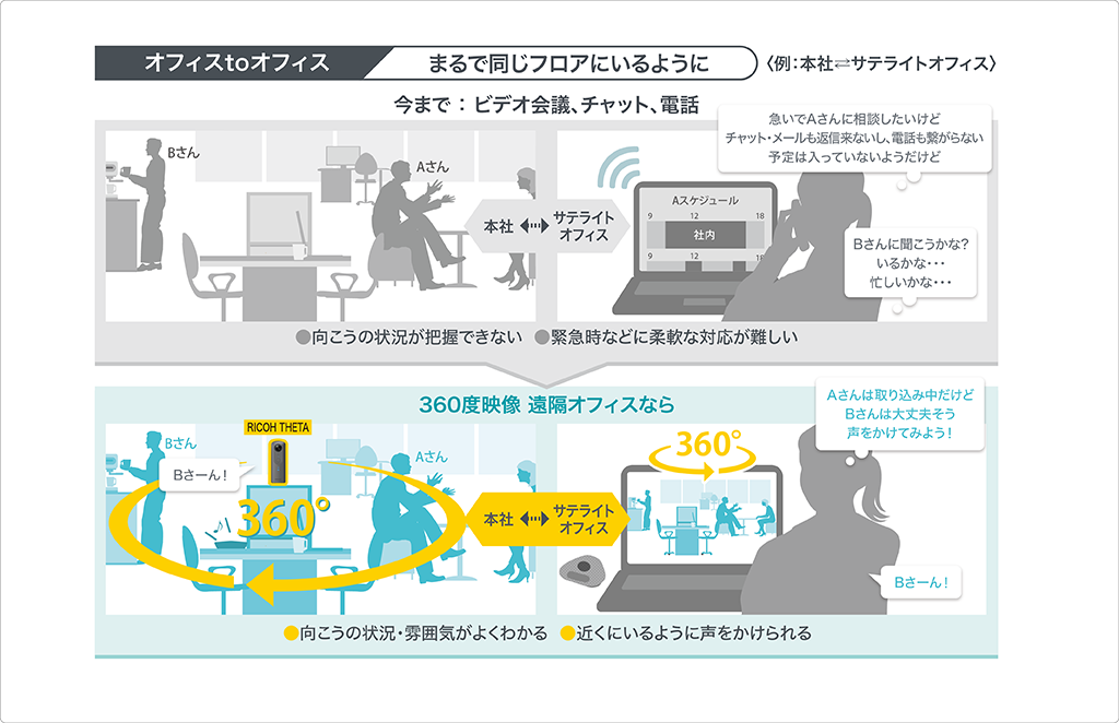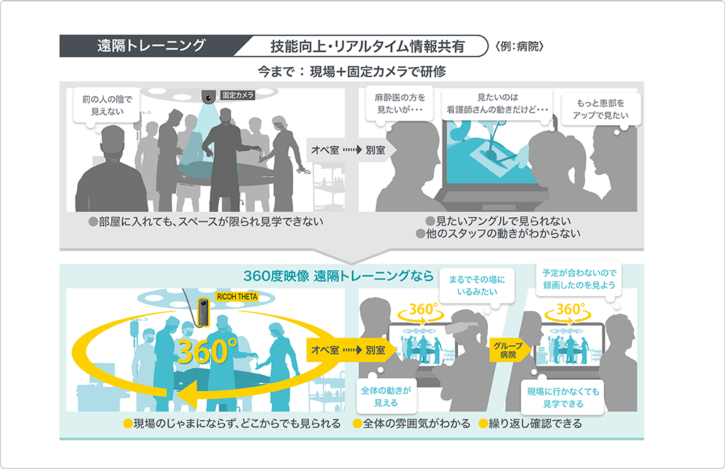 パソコンや Android デバイスに RICOH THETA* を外部カメラとして接続し、カンタン操作で 360度全天球映像をライブ配信できます。オフィス・会議室や作業現場・講演会・イベント会場・展示ルームなどさまざまなシーンで、臨場感のあるより身近なコミュニケーションを実現します。